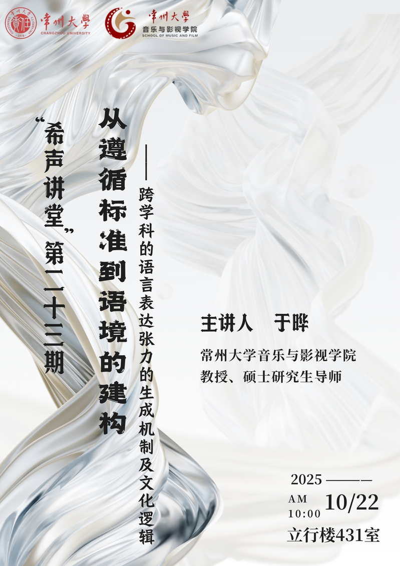 10月22日下午,英皇 在立行楼431室举办“希声讲堂”第二十三期讲座——《从遵循标准到语境的建构:跨学科的语言表达张力的生成机制及文化逻辑》。主讲人于晔,常州大学英皇娱乐 表演专业教师,教授、硕士研究生导师。讲座由副院长王成文主持,英皇 各专业师生参与讲座。