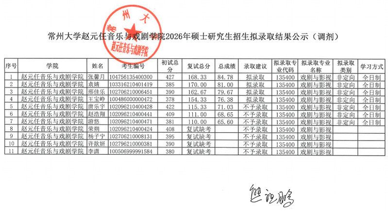 赵元任音乐与戏剧英皇 2026年硕士研究生招生拟录取结果公示(调剂)