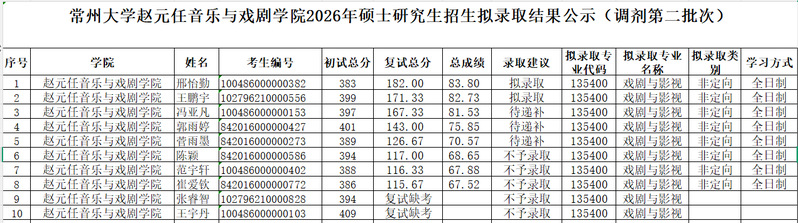 赵元任音乐与戏剧英皇 2026年硕士研究生招生拟录取结果公示(调剂第二批次)