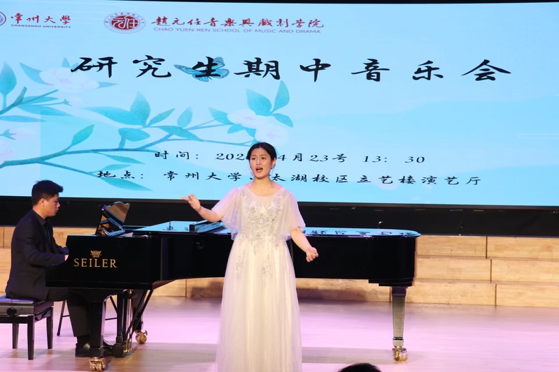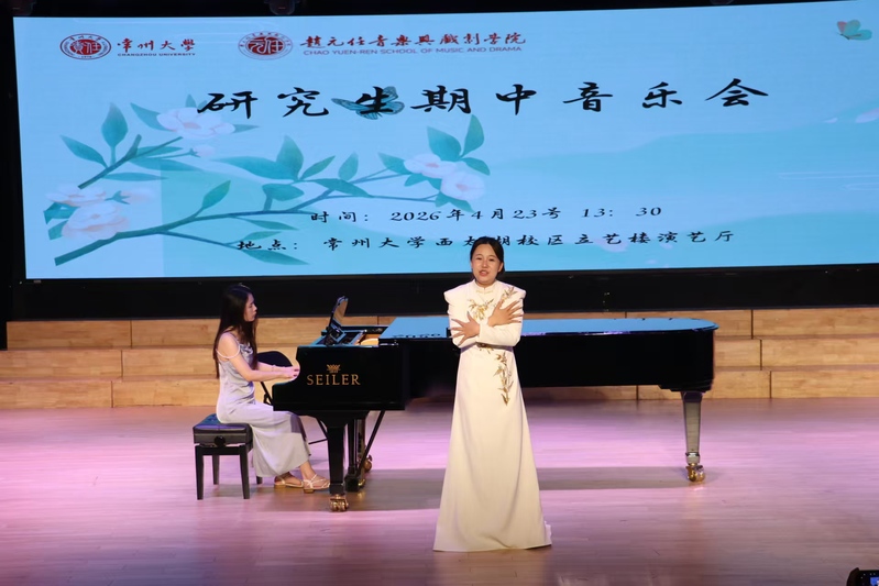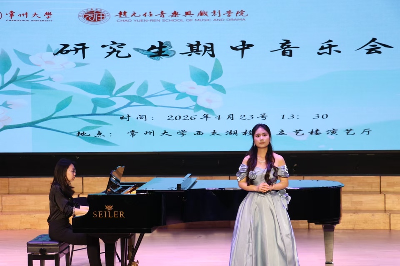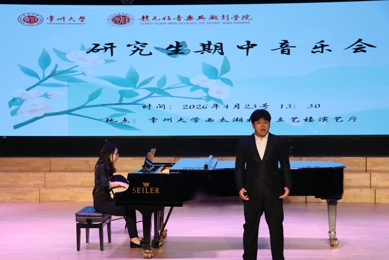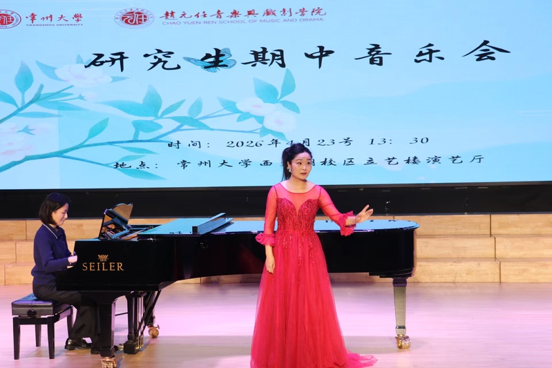 2026 年 4 月 23 日 13:30,常州大学赵元任音乐与戏剧英皇 2025—2026 学年第二学期声乐表演方向硕士研究生期中音乐会在西太湖校区立艺楼演艺厅顺利举办。研一、研二年级的8名声乐表演方向研究生现场演绎24首中外经典声乐作品。英皇 领导及音乐系全体师生共同观看了本次音乐会。